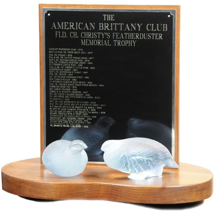 H.D. “Butch” Gerlach of the Midwest Brittany Club donated the Christy Feather Duster award to honor the highest placing bitch in the National trials. The award was started in memory of Dusty, Butch’s field champion bitch who died at an early age. The rotating trophy is a pair of Lalique quail on a rosewood base.