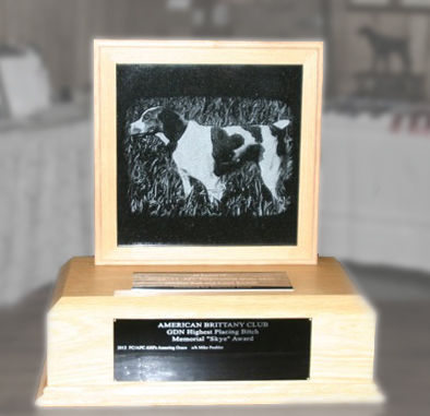 This trophy shall be called the “Skye” trophy in honor of the 1st bitch to win GDN; NGDC/FC/AFC Perpetuators Misty Skye. It shall be a non-retireable rotating trophy. The owner of the winner will receive a keeper plaque or trophy similar to those awarded with other non-retireable trophies. The trophy was donated by Darlene Dow and is a granite laser engraving of Skye framed on a wood base. At Ms. Dow’s request and with the Board’s approval, this award is made to the owner of the highest placing bitch in the National Gun Dog trials. In the case of tying placements between the open and the amateur the open bitch will receive the award. |